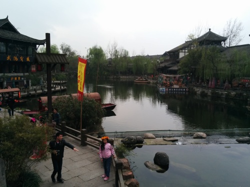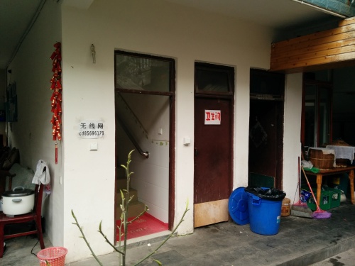 Am Eingang gibt es typisch chinesische Touristenarchitektur (=viel Beton) und ein durchdesigntes Landschaftsbild (=Fluss im Betonbett) zu bewundern. Es gibt einige Restaurants und viele Läden, die Souvenirs oder Spielzeug verkaufen. Wenn man dann aber weiter geht kommt man auch zu verwinkelten Gassen, wo das Leben etwas langsamer tickt und auch noch Leute zu wohnen scheinen. Wer beim Anblick der Bilder unten aber denkt, dass das Örtchen völlig zurückgeblieben ist, dem sei gesagt, dass der Zettel an der Hauswand im rechten Bild die Zugangsdaten für das öffentliche WLAN angibt.